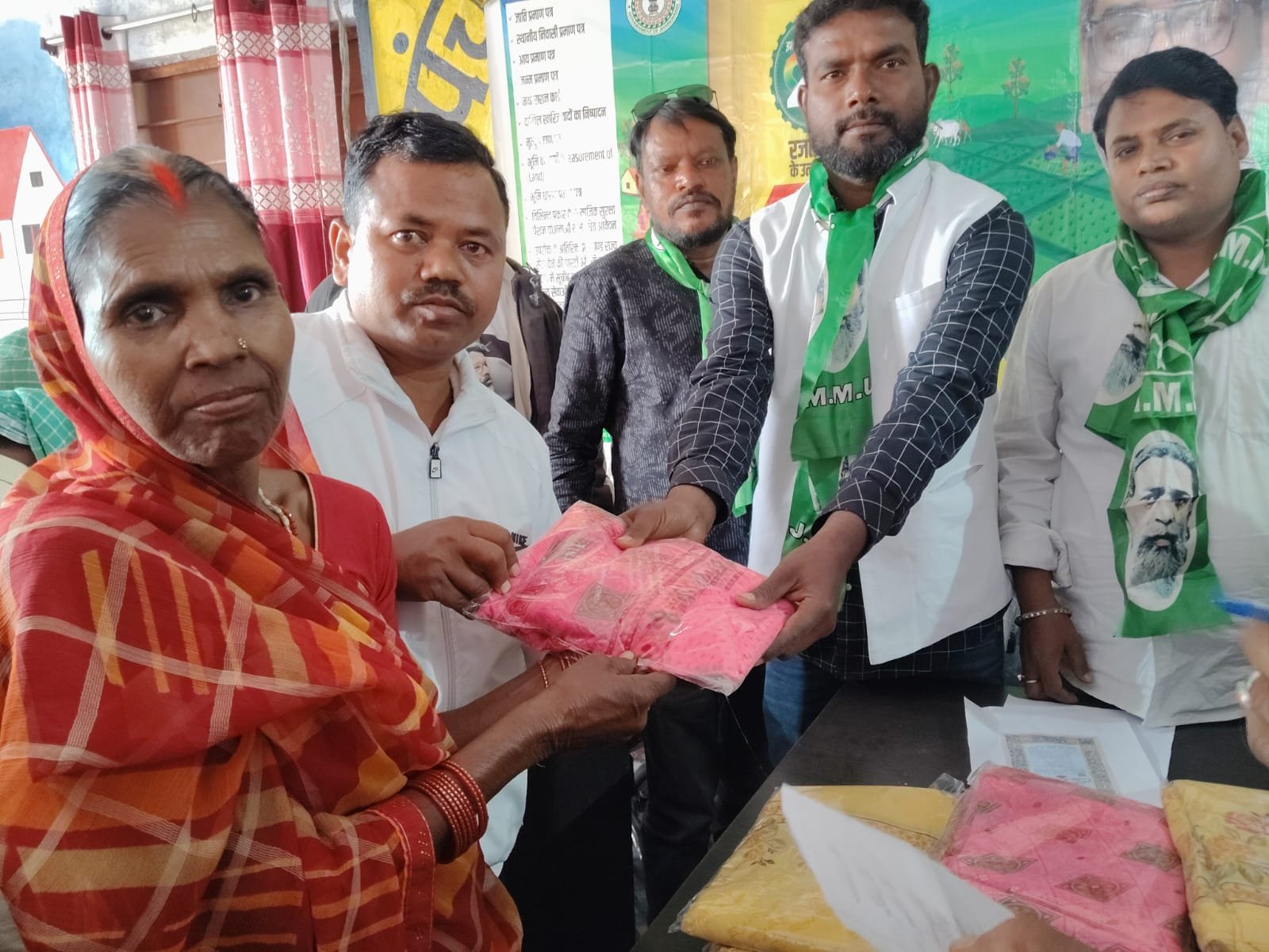 फोटो 0 चूरी दक्षिणी पंचायत में आपकी योजना आपकी सरकार आपके द्वार कार्यक्रम में लाभुक को साड़ी वितरित करते मुखिया मलका मुंडा सहित अन्य।