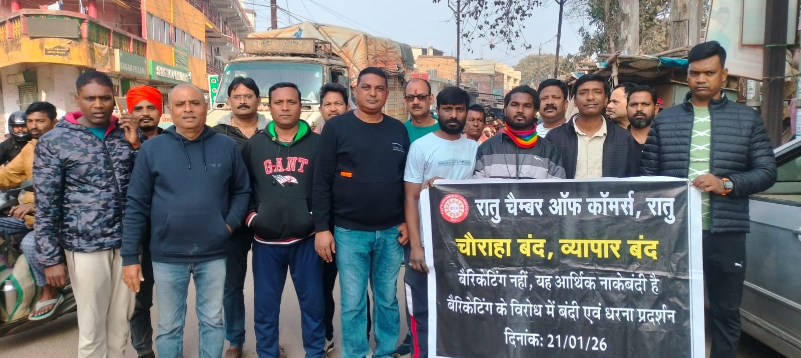 रातू एनएचआई की ओर से काठीटांड चौक में की गयी बेरिकेटिंग के खिलाफ चेंबर ऑफ कॉमर्स के लोगो ने बुधवार को रातु कठिटांड की सभी दुकान बंद रखने का ऐलान किया है। इसकी पूर्व संध्या पर मंगलवार की शाम 7 बजे दुकानदारों ने मशाल जुलूस निकाल कर विरोध प्रदर्शन किया और प्रशासन के खिलाफ जमकर नारेबाजी की। चेंबर ऑफ कॉमर्स के अध्यक्ष जगदीश साहू की अगुवाई में निकाली गयी मशाल जुलूस को कई राजीनीतिक व सामाजिक संगठनों ने समर्थन किया है। चेंबर के अध्यक्ष जगदीश साहू ने बताया की एनएचएआई की ओर से रातु काठी टांड की सभी बैरिकेटिंग बंद कर दिया गया है।