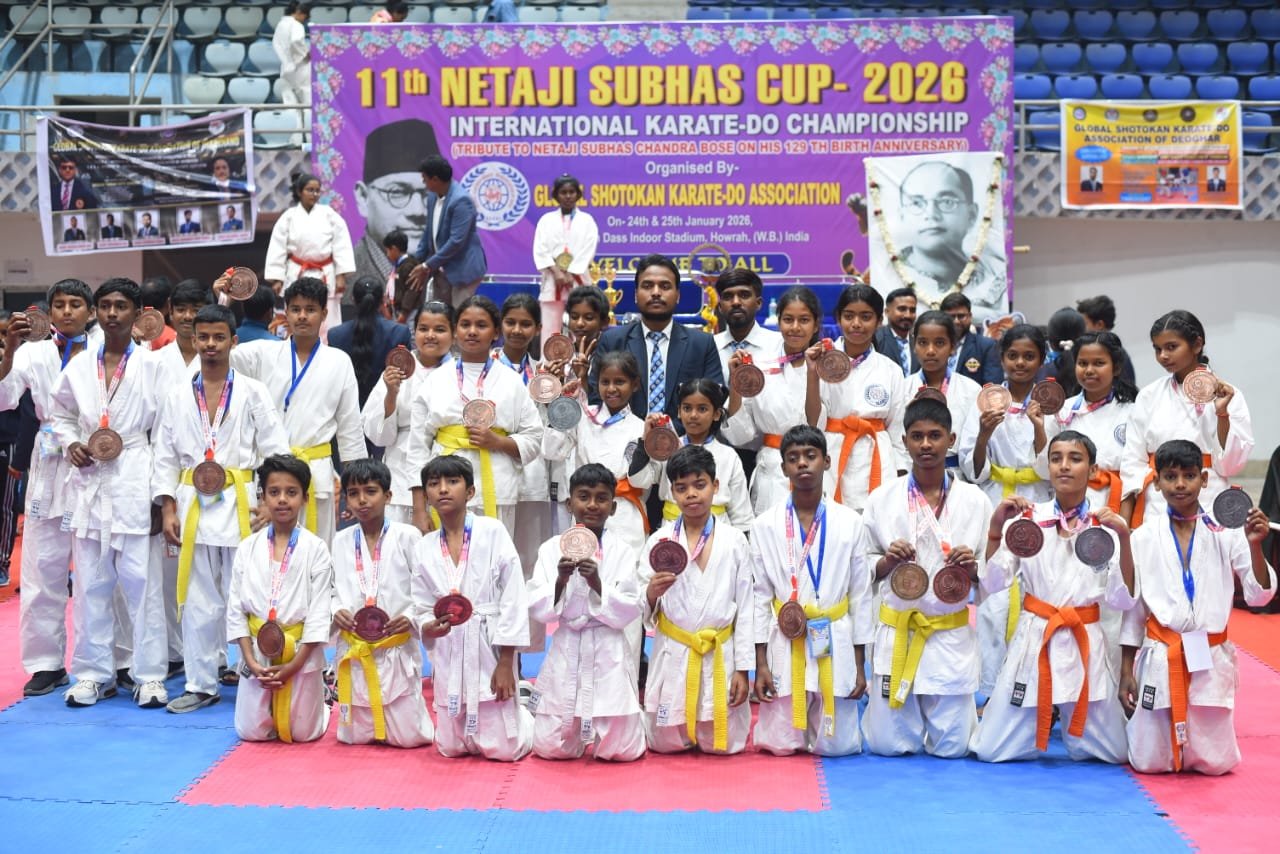 बुंडू। महात्मा एनडी ग्रोवर डीएवी पब्लिक स्कूल गोसाईडीह बुंडू के छात्रों ने 11वें नेताजी सुभाष कप–2026 अंतरराष्ट्रीय कराटे-डो चैंपियनशिप में उत्कृष्ट प्रदर्शन किया। विद्यालय के 18 छात्रों ने झारखंड का प्रतिनिधित्व करते हुए विभिन्न वर्गों में 1 स्वर्ण, 3 रजत एवं 14 कांस्य पदक जीतकर विद्यालय का नाम रोशन किया। यह प्रतियोगिता ग्लोबल शोतोकान कराटे-डो एसोसिएशन द्वारा 24 एवं 25 जनवरी 2026 को अलमहान दास इंडोर स्टेडियम, हावड़ा (पश्चिम बंगाल) में आयोजित की गई। यह चैंपियनशिप नेताजी सुभाष चंद्र बोस की 129वीं जयंती के उपलक्ष्य में आयोजित की गई। विद्यालय के प्रधानाचार्य दीपक कुमार ने सभी विजेताओं एवं प्रतिभागियों को उनकी उपलब्धि के लिए बधाई देते हुए उनके उज्ज्वल भविष्य की शुभकामनायें दीं। फोटो