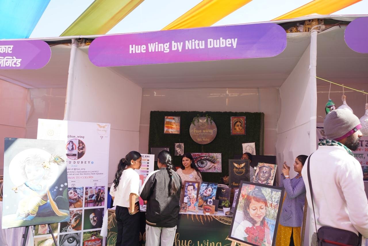 अंतरराष्ट्रीय स्तर पर प्रसिद्ध हाइपर-रियलिस्टिक पोर्ट्रेट कलाकार एवं TEDx स्पीकर नीतू दुबे (Hue Wing स्टॉल), जो मात्र 5 मिनट में किसी का भी लाइव स्केच तैयार करने में विशेषज्ञ हैं।