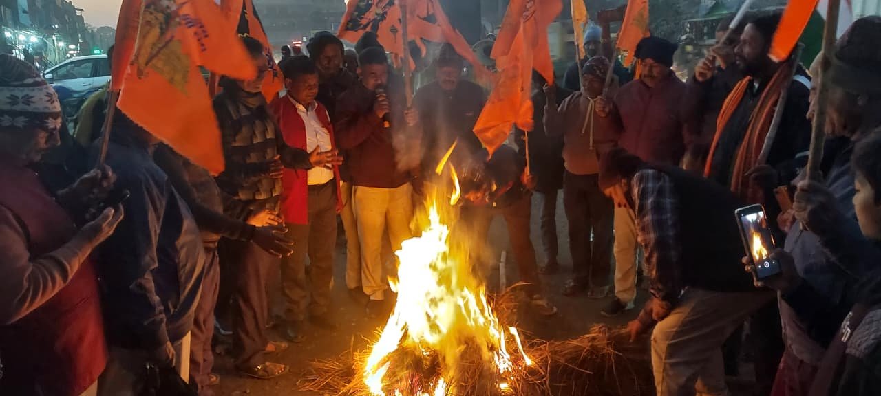 नामकुम। महुआ टोली लालगंज स्थित हनुमान मंदिर परिसर से सोमवार को महावीर मंदिर अध्यक्ष संजीत सिंह के नेतृत्व में विभिन्न हिंदू संगठनों के कार्यकर्ताओं ने सूर्यनगर, हरिनगर, आदर्श नगर होते हुए टाटीसिलवे थाना हरिप्रसाद चौक तक बांग्लादेश में हिंदू युवक की हत्या के विरोध में शव यात्रा निकाला और पुतला जलाया। इस दौरान कार्यकर्ताओं ने बांग्लादेश की अंतरिम सरकार के मुखिया यूनुस खान के खिलाफ जमकर नारेबाजी की। मौके पर महावीर मंदिर के अध्यक्ष संजीत सिंह ने कहा कि बांग्लादेश में हिंदुओं का उत्पीड़न किया जा रहा है। वहां की सरकार रक्षा नही कर पा रही है। ऐसी सरकार को सत्ता में रहने का हक नही है। उन्होंने कहा कि बांग्लादेश में युवक की हत्या की जांच की जाए और दोषियों पर कड़ी कार्रवाई की जाए। इसके साथ ही हिंदुओं की रक्षा की जाए। पूर्व कर्नल बीके सिंह ने कहा कि बांग्लादेश में हिंदू परिवरों पर हो रहे अत्याचारों के मामले में कड़ा कूटनीतिक अपनाया जाए। इस तरह की घटनाएं किसी भी सूरत में अब बर्दाश्त नही की जाएगी। इस दौरान कार्यकर्ताओं ने बांग्लादेश मुर्दाबाद, हिंदुओं पर अत्याचार बंद करों और दीपू चंद्र दास को न्याय दो जैसे नारे लगाए। आरोप लगाया कि बांग्लादेश में सुनियोजित तरीके से अल्पसंख्यक हिंदुओं को निशाना बनाया जा रहा है। उन्होंने केंद्र सरकार से मांग की कि बांग्लादेश सरकार पर अंतरर्राष्ट्रीय स्तर पर दबाव बनाकर हिंदुओं की सुरक्षा सुनिश्चित करें और पीड़ित परिवार को न्याय दिलाए। शव यात्रा में खिजरी के पूर्व विधायक आरके पाहन, टाटीपश्चिमी संयोजक विनोद कुमार शाही, टाटीसिलवे मंडल अध्यक्ष पुरुषोत्तम मिश्रा, अमित कुमार मिश्रा, गिरिधर मिश्रा, गाजू महतो, सरयुग प्रसाद, ब्रजेश सिंह, प्रशांत किशोर, वीणा शर्मा, उपचंद्र महतो, परशुराम सिंह, सुभाष पांडेय, सुभाष श्रीवास्तव, अशोक पासवान समेत सैकड़ों लोग शामिल हुए।
