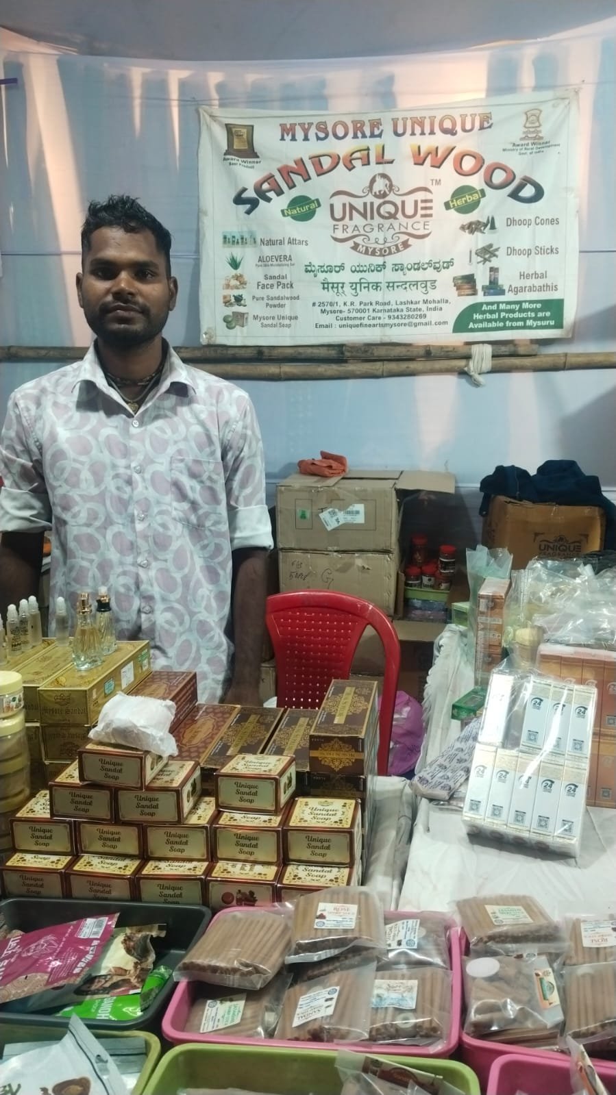 इसी क्रम में स्टॉल संख्या 107 – यूनिक फ्रेगरेंस मैसूर सैंडलवुड (कर्नाटक) एक्सपो के प्रमुख आकर्षणों में शामिल है। मैसूर के पारंपरिक सुगंधित अगरबत्ती उत्पादों की विशिष्ट रेंज, वहां के कुशल कारीगरों द्वारा निर्मित की जा रही है, जो विरासत संरक्षण एवं कारीगर सशक्तिकरण का उत्कृष्ट उदाहरण प्रस्तुत करती है।