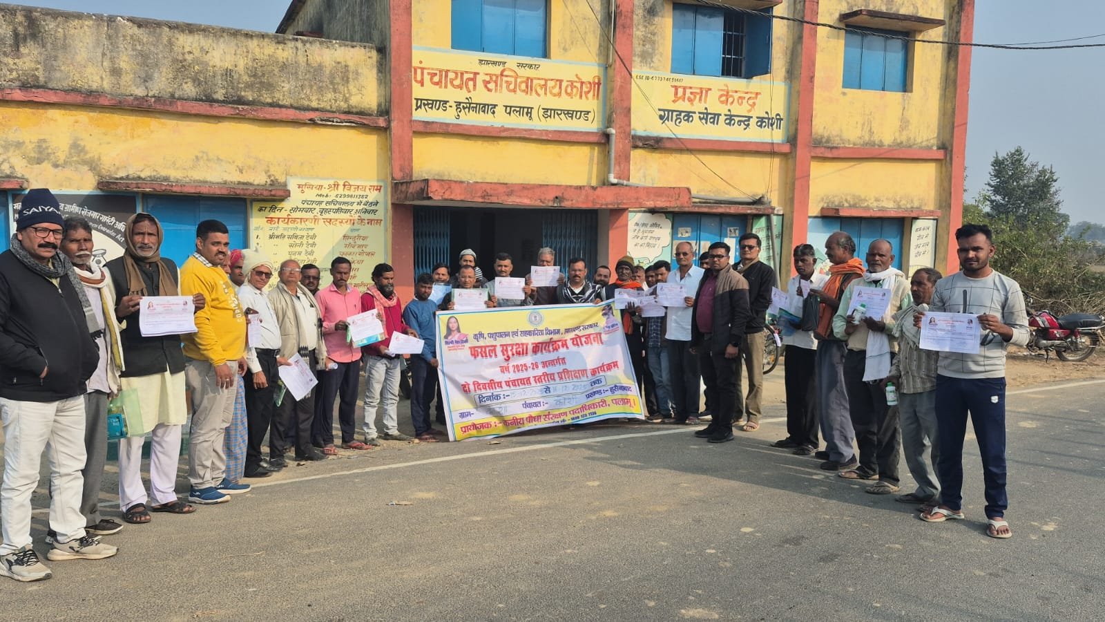 हुसैनाबाद प्रखंड अंतर्गत कोशी पंचायत भवन में फसल सुरक्षा कार्यक्रम के तहत दो दिवसीय प्रशिक्षण कार्यक्रम आयोजित किया गया।प्रशिक्षण कार्यक्रम का संचालन प्रखंड तकनीकी प्रबंधक जयगोविंद यादव ने किया तथा विभागीय योजनाओं के बारे में जानकारी दिया।कार्यक्रम के दौरान पौधा संरक्षण केंद्र प्रभारी बीरेंद्र प्रसाद , प्रशिक्षक प्रशांत कुमार, एवं बिकाश कुमार सिंह ने फसल सुरक्षा को लेकर किसानों को जागरूक किया।फल,सब्जी व रबी सीजन मे लगाए जाने वाले फसलो मे लगने वाले रोग तथा कीटो से बचाव हेतू विस्तार से चर्चा की गयी। साथ ही रासायनिक उर्वरक एवं रासायनिक कीटनाशक का प्रयोग से मृदा एवं मानव जीवन पर पड़ने वाले दुष्प्रभाव के बारे मे किसानों को बिस्तार से बताया गया। साथ ही प्रशिक्षकों ने किसानों से अनुरोध किया कि किसान अपने खेतो मे अधिक से अधिक जैव आधारित उर्वरक एवं जैविक कीटनाशक का प्रयोग करे।जिससे खेतों की उर्वरा शक्ति बनी रहे। कार्यक्रम में ग्राम पंचायत के मुखिया बिजय राम के अलावे पंचायत के 40 किसानों ने प्रशिक्षण में भागीदारी की। मौके पर किसान मित्र अजय कुमार सिंह, सतेंद्र सिंह, अरुण बैध, जानेश्वर राम समेत कई अन्य किसान उपस्थित थे।
