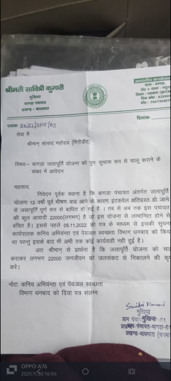 मुखिया सावित्री कुमारी ने कहा कि 22 हजार की आबादी वाली पंचायत आज भी नेताओं की उपेक्षा के कारण प्यास से जूझ रही है। जलापूर्ति योजना वर्षों से ठप है और ग्रामीणों को रोज कई किलोमीटर दूर दामोदर नदी से पानी लाना पड़ता है। 5 नवंबर 2022 को विभाग को लिखित सूचना देने के बावजूद कोई कार्रवाई नहीं हुई। उन्होंने कहा कि अब पूरी उम्मीद सिर्फ सांसद पर टिकी है कि वे इस संकट का समाधान कराएँगे।